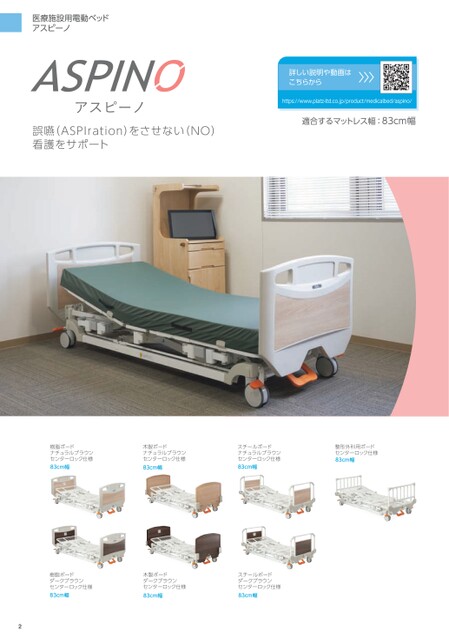 医療施設用電動ベッドアスピーノ誤嚥(ASPIration)をさせない(NO)看護をサポート詳しい説明や動画はこちらからhttps://www.platz-ltd.co.jp/product/medicalbed/aspino/適合するマットレス幅:83cm幅樹脂ボードナチュラルブラウンセンターロック仕様83cm幅木製ボードナチュラルブラウンセンターロック仕様83cm幅スチールボードナチュラルブラウンセンターロック仕様83cm幅整形外科用ボードセンターロック仕様83cm幅樹脂ボードダークブラウンセンターロック仕様83cm幅木製ボードダークブラウンセンターロック仕様83cm幅スチールボードダークブラウンセンターロック仕様83cm幅