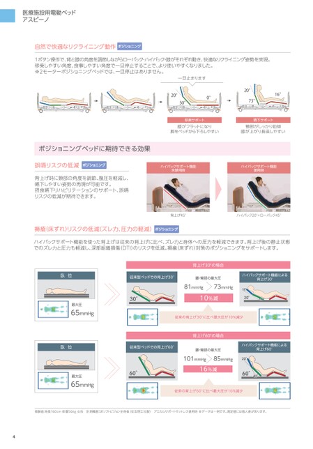 医療施設用電動ベッドアスピーノ自然で快適なリクライニング動作ポジショニング1ボタン操作で、背と膝の角度を調節しながらローバック・ハイバック・膝がそれぞれ動き、快適なリクライニング姿勢を実現。移乗しやすい角度、食事しやすい角度で一旦停止することで、より使いやすくなりました。※2モーターポジショニングベッドでは、一旦停止はありません。一旦止まります20°50°0°20°73°16°移乗サポート嚥下サポート膝がフラットになり脚をベッドから下ろしやすい頸部がしっかり前傾膝が上がり長座しやすいハイバックサポート機能未使用時ハイバックサポート機能使用時ポジショニングベッドに期待できる効果誤嚥リスクの低減ポジショニング背上げ時に頸部の角度を調節、腹圧を軽減し、嚥下しやすい姿勢の再現が可能です。摂食嚥下リハビリテーションのサポート、誤嚥リスクの低減が期待できます。背上げ45°ハイバック20°+ローバック45°褥瘡(床ずれ)リスクの低減(ズレ力、圧力の軽減)ポジショニングハイバックサポート機能を使った背上げは従来の背上げに比べ、ズレ力と身体への圧力を軽減できます。背上げ後の静止状態でのズレ力と圧力も軽減し、深部組織損傷(DTI)のリスクを低減。褥瘡(床ずれ)対策のポジショニングをサポートします。臥位従来型ベッドでの背上げ30°腰・臀部の最大圧ハイバックサポート機能による背上げ30°背上げ30の場合81mmHg73mmHg30°10%減°°°最大圧65mmHg従来の背上げ30°に比べ最大圧が10%減少背上げ60の場合臥位従来型ベッドでの背上げ60°腰・臀部の最大圧ハイバックサポート機能による背上げ60°最大圧65mmHg60°101mmHg85mmHg20°16%減60°40°従来の背上げ60°に比べ最大圧が16%減少被験者:身長160cm体重56kg女性計測機器:SRソフトビジョン全身版(住友理工社製)アミカルサポートマットレス使用時※データは一例です。測定値には個人差があります。