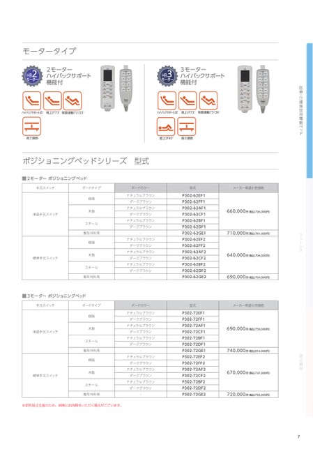 医療・介護施設用電動ベッドマットレス周辺機器モータータイプHB2モーターハイバックサポート機能付HB3モーターハイバックサポート機能付ハイバックサポート20°背上げ73°背膝連動73°/23°ハイバックサポート20°背上げ73°背膝連動73°/36°高さ調節膝上げ40°高さ調節ポジショニングベッドシリーズ型式■2モーターポジショニングベッド手元スイッチボードタイプボードカラー型式メーカー希望小売価格液晶手元スイッチ標準手元スイッチ樹脂木製スチール整形外科用樹脂木製スチール整形外科用ナチュラルブラウンダークブラウンナチュラルブラウンダークブラウンナチュラルブラウンダークブラウン-ナチュラルブラウンダークブラウンナチュラルブラウンダークブラウンナチュラルブラウンダークブラウン-P302-62EF1P302-62FF1P302-62AF1P302-62CF1P302-62BF1P302-62DF1P302-62GE1P302-62EF2P302-62FF2P302-62AF2P302-62CF2P302-62BF2P302-62DF2P302-62GE2660,000円(税込726,000円)710,000円(税込781,000円)640,000円(税込704,000円)690,000円(税込759,000円)■3モーターポジショニングベッド手元スイッチボードタイプボードカラー型式メーカー希望小売価格液晶手元スイッチ標準手元スイッチ樹脂木製スチール整形外科用樹脂木製スチール整形外科用ナチュラルブラウンダークブラウンナチュラルブラウンダークブラウンナチュラルブラウンダークブラウン-ナチュラルブラウンダークブラウンナチュラルブラウンダークブラウンナチュラルブラウンダークブラウン-P302-72EF1P302-72FF1P302-72AF1P302-72CF1P302-72BF1P302-72DF1P302-72GE1P302-72EF2P302-72FF2P302-72AF2P302-72CF2P302-72BF2P302-72DF2P302-72GE2690,000円(税込759,000円)740,000円(税込814,000円)670,000円(税込737,000円)720,000円(税込792,000円)※原則受注生産のため、納期にお時間をいただく場合がございます。
