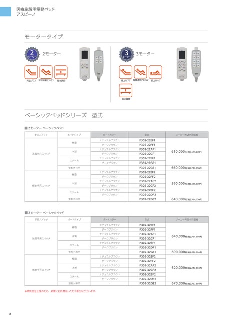 医療施設用電動ベッドアスピーノモータータイプ2モーター3モーター背上げ73°背膝連動73°23°高さ調節背上げ73°背膝連動73°/36°膝上げ40°高さ調節ベーシックベッドシリーズ型式■2モーターベーシックベッド手元スイッチボードタイプボードカラー型式メーカー希望小売価格液晶手元スイッチ標準手元スイッチ樹脂木製スチール整形外科用樹脂木製スチール整形外科用ナチュラルブラウンダークブラウンナチュラルブラウンダークブラウンナチュラルブラウンダークブラウン-ナチュラルブラウンダークブラウンナチュラルブラウンダークブラウンナチュラルブラウンダークブラウン-P302-22EF1P302-22FF1P302-22AF1P302-22CF1P302-22BF1P302-22DF1P302-22GE1P302-22EF2P302-22FF2P302-22AF2P302-22CF2P302-22BF2P302-22DF2P302-22GE2610,000円(税込671,000円)660,000円(税込726,000円)590,000円(税込649,000円)640,000円(税込704,000円)■3モーターベーシックベッド手元スイッチボードタイプボードカラー型式メーカー希望小売価格液晶手元スイッチ標準手元スイッチ樹脂木製スチール整形外科用樹脂木製スチール整形外科用ナチュラルブラウンダークブラウンナチュラルブラウンダークブラウンナチュラルブラウンダークブラウン-ナチュラルブラウンダークブラウンナチュラルブラウンダークブラウンナチュラルブラウンダークブラウン-P302-32EF1P302-32FF1P302-32AF1P302-32CF1P302-32BF1P302-32DF1P302-32GE1P302-32EF2P302-32FF2P302-32AF2P302-32CF2P302-32BF2P302-32DF2P302-32GE2640,000円(税込704,000円)690,000円(税込759,000円)620,000円(税込682,000円)670,000円(税込737,000円)※原則受注生産のため、納期にお時間をいただく場合がございます。