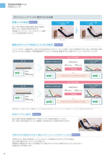 医療施設用電動ベッドP300シリーズポジショニングベッドに期待できる効果誤嚥リスクの低減ポジショニング背上げ時に頸部の角度を調節、腹圧を軽減し、嚥下しやすい姿勢の再現が可能です。摂食嚥下リハビリテーションのサポート、誤嚥リスクの低減が期待できます。ハイバックサポート機能未使用時ハイバックサポート機能使用時背上げ45°ハイバック20°+ローバック45°褥瘡(床ずれ)リスクの低減(ズレ力、圧力の軽減)ポジショニングハイバックサポート機能を使った背上げは従来の背上げに比べ、ズレ力と身体への圧力を軽減できます。背上げ後の静止状態でのズレ力と圧力も軽減し、深部組織損傷(DTI)のリスクを低減。褥瘡(床ずれ)対策のポジショニングをサポートします。臥位従来型ベッドでの背上げ30°腰・臀部の最大圧ハイバックサポート機能による背上げ30°背上げ30の場合最大圧59mmHg62mmHg56mmHg30°10%減°°°従来の背上げ30°に比べ最大圧が10%減少背上げ60の場合臥位従来型ベッドでの背上げ60°腰・臀部の最大圧ハイバックサポート機能による背上げ60°最大圧59mmHg60°76mmHg65mmHg20°15%減60°40°従来の背上げ60°に比べ最大圧が15%減少被験者:身長164cm体重57kg男性計測機器:SRソフトビジョン全身版(住友理工社製)アミカルサポートマットレス使用時※データは一例です。測定値には個人差があります。呼吸がしやすい姿勢にポジショニング背圧や腹圧を軽減し横隔膜を広げ、呼吸がしやすい快適な姿勢をつくります。また、体幹上部を屈曲することで、循環器への負荷を抑える効果が期待できます。円背の方から妊娠中の方まで、幅広くポジショニングをサポートしますポジショニング円背の方でも、脊柱の湾曲部にハイバックサポートの角度を合わせることができる場合、背上げ時の適切なポジショニングが可能です。股関節の可動域が狭く背上げが困難な方や、腹圧がかけられない妊娠中の方にもズレ力の少ない快適な背上げを提供します。