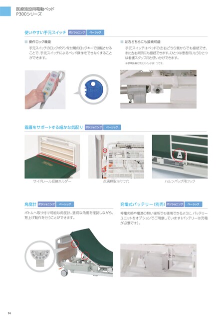 医療施設用電動ベッドP300シリーズ使いやすい手元スイッチポジショニングベーシック■操作ロック機能■左右どちらにも接続可能手元スイッチのロックボタンを付属のロックキーで回転させる手元スイッチはベッドの左右どちら側からでも接続でき、ことで、手元スイッチによるベッド操作をできなくすることまた左右同時にも接続できます。ひとつは患者用、もうひとつができます。は看護スタッフ用と使い分けできます。※標準装備の手元スイッチは1つです。看護をサポートする細かな気配りポジショニングベーシックサイドレール収納ホルダー点滴棒取り付け穴ハルンバッグ用フック角度計ポジショニングベーシック充電式バッテリー(別売)ポジショニングベーシックボトムへ取り付け可能な角度計。適切な角度を確認しながら、停電の時や電源の無い場所でも使用できるように、バッテリー背上げ動作を行うことができます。ユニットをオプションでご用意しています(バッテリーは充電が必要です)。