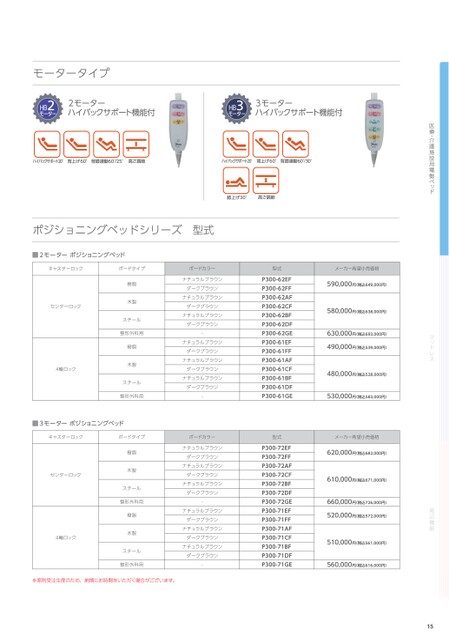 医療・介護施設用電動ベッドマットレス周辺機器モータータイプHB2モーターハイバックサポート機能付HB3モーターハイバックサポート機能付ハイバックサポート20°背上げ60°背膝連動60°25°高さ調節ハイバックサポート20°背上げ60°背膝連動60°/30°膝上げ30°高さ調節ポジショニングベッドシリーズ型式■2モーターポジショニングベッドキャスターロックボードタイプボードカラー型式メーカー希望小売価格センターロック4輪ロック樹脂木製スチール整形外科用樹脂木製スチール整形外科用ナチュラルブラウンダークブラウンナチュラルブラウンダークブラウンナチュラルブラウンダークブラウン-ナチュラルブラウンダークブラウンナチュラルブラウンダークブラウンナチュラルブラウンダークブラウン-P300-62EFP300-62FFP300-62AFP300-62CFP300-62BFP300-62DFP300-62GEP300-61EFP300-61FFP300-61AFP300-61CFP300-61BFP300-61DFP300-61GE590,000円(税込649,000円)580,000円(税込638,000円)630,000円(税込693,000円)490,000円(税込539,000円)480,000円(税込528,000円)530,000円(税込583,000円)■3モーターポジショニングベッドキャスターロックボードタイプボードカラー型式メーカー希望小売価格センターロック4輪ロック樹脂木製スチール整形外科用樹脂木製スチール整形外科用ナチュラルブラウンダークブラウンナチュラルブラウンダークブラウンナチュラルブラウンダークブラウン-ナチュラルブラウンダークブラウンナチュラルブラウンダークブラウンナチュラルブラウンダークブラウン-P300-72EFP300-72FFP300-72AFP300-72CFP300-72BFP300-72DFP300-72GEP300-71EFP300-71FFP300-71AFP300-71CFP300-71BFP300-71DFP300-71GE620,000円(税込682,000円)610,000円(税込671,000円)660,000円(税込726,000円)520,000円(税込572,000円)510,000円(税込561,000円)560,000円(税込616,000円)※原則受注生産のため、納期にお時間をいただく場合がございます。