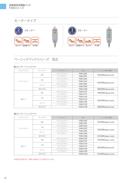医療施設用電動ベッドP300シリーズモータータイプ2モーター3モーター背上げ70°背膝連動70°25°高さ調節背上げ70°背膝連動70°/30°膝上げ30°高さ調節ベーシックベッドシリーズ型式■2モーターベーシックベッドキャスターロックボードタイプボードカラー型式メーカー希望小売価格センターロック4輪ロック樹脂木製スチール整形外科用樹脂木製スチール整形外科用ナチュラルブラウンダークブラウンナチュラルブラウンダークブラウンナチュラルブラウンダークブラウン-ナチュラルブラウンダークブラウンナチュラルブラウンダークブラウンナチュラルブラウンダークブラウン-P300-22EFP300-22FFP300-22AFP300-22CFP300-22BFP300-22DFP300-22GEP300-21EFP300-21FFP300-21AFP300-21CFP300-21BFP300-21DFP300-21GE540,000円(税込594,000円)530,000円(税込583,000円)580,000円(税込638,000円)440,000円(税込484,000円)430,000円(税込473,000円)480,000円(税込528,000円)■3モーターベーシックベッドキャスターロックボードタイプボードカラー型式メーカー希望小売価格センターロック4輪ロック樹脂木製スチール整形外科用樹脂木製スチール整形外科用ナチュラルブラウンダークブラウンナチュラルブラウンダークブラウンナチュラルブラウンダークブラウン-ナチュラルブラウンダークブラウンナチュラルブラウンダークブラウンナチュラルブラウンダークブラウン-P300-32EFP300-32FFP300-32AFP300-32CFP300-32BFP300-32DFP300-32GEP300-31EFP300-31FFP300-31AFP300-31CFP300-31BFP300-31DFP300-31GE570,000円(税込627,000円)560,000円(税込616,000円)610,000円(税込671,000円)470,000円(税込517,000円)460,000円(税込506,000円)510,000円(税込561,000円)※原則受注生産のため、納期にお時間をいただく場合がございます。