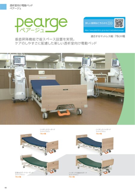 透析室向け電動ベッドペアージュ垂直昇降機能で省スペース設置を実現。ケアのしやすさに配慮した新しい透析室向け電動ベッド詳しい説明はこちらからhttps://www.platz-ltd.co.jp/product/medicalbed/pearge/適合するマットレス幅:78cm幅ハイボード・ローボードライトブラウン78cm幅ハイボード・ハイボードライトブラウン78cm幅記録台付ボード・ローボードライトブラウン78cm幅ハイボード・記録台付ボードライトブラウン78cm幅