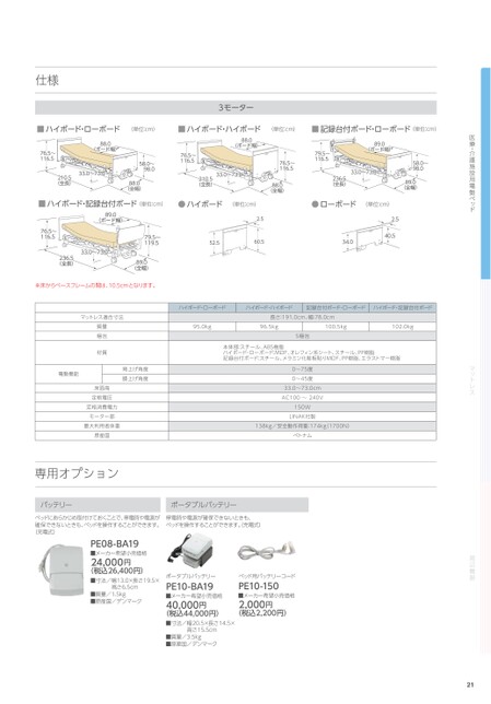 医療・介護施設用電動ベッドマットレス周辺機器仕様3モーター■ハイボード・ローボード(単位:cm)■ハイボード・ハイボード(単位:cm)■記録台付ボード・ローボード(単位:cm)88.0(ボード幅)76.5〜116.533.0〜73.0210.5(全長)58.0〜98.088.0(全幅)88.0(ボード幅)76.5〜116.533.0〜73.0210.5(全長)76.5〜116.588.0(全幅)89.0(ボード幅)79.5〜116.533.0〜73.0236.5(全長)58.0〜98.089.0(全幅)■ハイボード・記録台付ボード(単位:cm)●ハイボード(単位:cm)●ローボード(単位:cm)89.0(ボード幅)76.5〜116.579.5〜119.552.52.560.52.540.534.033.0〜73.0236.5(全長)89.0(全幅)※床からベースフレームの間は、10.5cmとなります。ハイボード・ローボードハイボード・ハイボード記録台付ボード・ローボードハイボード・記録台付ボードマットレス適合寸法長さ:191.0cm、幅:78.0cm質量梱包材質95.0kg96.5kg100.5kg102.0kg5梱包本体部:スチール、ABS樹脂ハイボード・ローボード:MDF、オレフィン系シート、スチール、PP樹脂記録台付ボード:スチール、メラミン化粧板貼りMDF、PP樹脂、エラストマー樹脂電動機能背上げ角度膝上げ角度床面高定格電圧定格消費電力モーター部最大利用者体重原産国専用オプション0〜75度0〜45度33.0〜73.0cmAC100〜240V150WLINAK社製138kg/安全動作荷重:174kg1700N)ベトナムバッテリーポータブルバッテリーベッドにあらかじめ取付けておくことで、停電時や電源が停電時や電源が確保できないときも、確保できないときも、ベッドを操作することができます。ベッドを操作することができます。充電式)(充電式)PE08-BA19■メーカー希望小売価格24,000円(税込26,400円)■寸法/幅13.0×長さ19.5×高さ6.5cm■質量/1.5kg■原産国/デンマークポータブルバッテリーベッド用バッテリーコードPE10-BA19PE10-150■メーカー希望小売価格■メーカー希望小売価格40,000円(税込44,000円)2,000円(税込2,200円)■寸法/幅20.5×長さ14.5×高さ15.5cm■質量/3.5kg■原産国/デンマーク
