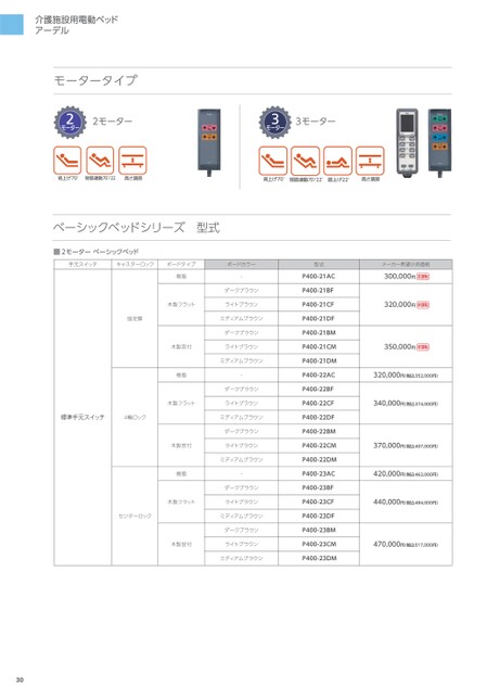介護施設用電動ベッドアーデルモータータイプ2モーター3モーター背上げ70°背膝連動70°/22高さ調節背上げ70°背膝連動70°/22°膝上げ22°高さ調節ベーシックベッドシリーズ型式■2モーターベーシックベッド手元スイッチキャスターロックボードタイプボードカラー型式メーカー希望小売価格樹脂-ダークブラウン木製フラットライトブラウンP400-21ACP400-21BFP400-21CF300,000円非課税320,000円非課税固定脚ミディアムブラウンP400-21DFダークブラウンP400-21BM木製宮付ライトブラウンP400-21CM350,000円非課税ミディアムブラウンP400-21DM樹脂-P400-22AC320,000円(税込352,000円)ダークブラウン木製フラットライトブラウンP400-22BFP400-22CF340,000円(税込374,000円)標準手元スイッチ4輪ロックミディアムブラウンP400-22DFダークブラウンP400-22BM木製宮付ライトブラウンP400-22CM370,000円(税込407,000円)ミディアムブラウンP400-22DM樹脂-P400-23AC420,000円(税込462,000円)ダークブラウン木製フラットライトブラウンP400-23BFP400-23CF440,000円(税込484,000円)センターロックミディアムブラウンP400-23DFダークブラウンP400-23BM木製宮付ライトブラウンP400-23CM470,000円(税込517,000円)ミディアムブラウンP400-23DM