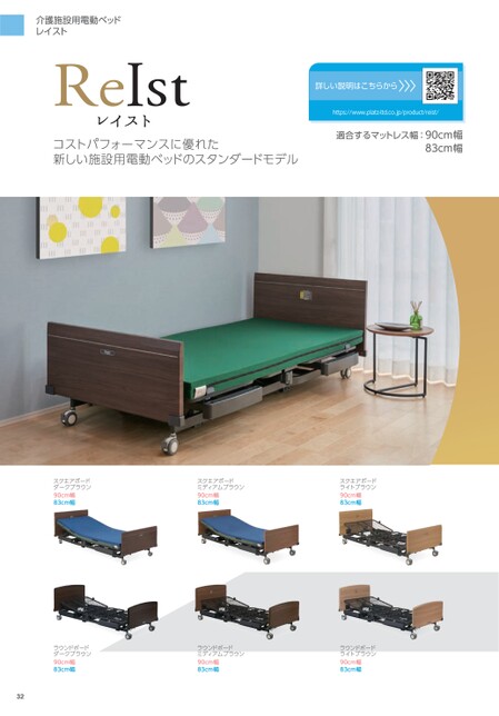 介護施設用電動ベッドレイストコストパフォーマンスに優れた新しい施設用電動ベッドのスタンダードモデル詳しい説明はこちらからhttps://www.platz-ltd.co.jp/product/reist/適合するマットレス幅:90cm幅83cm幅スクエアボードダークブラウン90cm幅83cm幅スクエアボードミディアムブラウン90cm幅83cm幅スクエアボードライトブラウン90cm幅83cm幅ラウンドボードダークブラウン90cm幅83cm幅ラウンドボードミディアムブラウン90cm幅83cm幅ラウンドボードライトブラウン90cm幅83cm幅