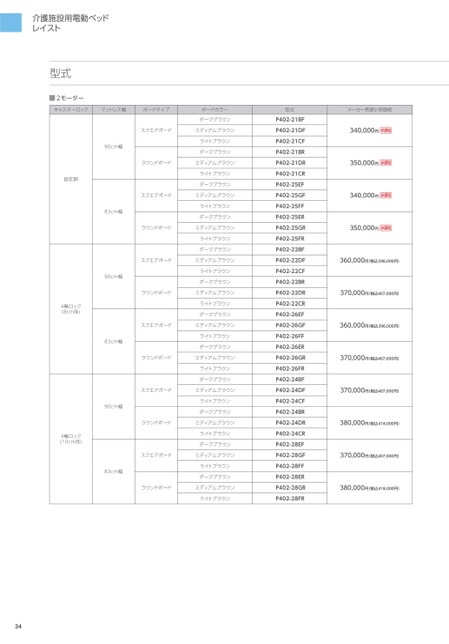 介護施設用電動ベッドレイスト型式■2モーターキャスターロックマットレス幅ボードタイプボードカラー固定脚4輪ロック(8cm径)4輪ロック(10cm径)90cm幅83cm幅90cm幅83cm幅90cm幅83cm幅ダークブラウンスクエアボードミディアムブラウンライトブラウンダークブラウンラウンドボードミディアムブラウンライトブラウンダークブラウンスクエアボードミディアムブラウンライトブラウンダークブラウンラウンドボードミディアムブラウンライトブラウンダークブラウンスクエアボードミディアムブラウンライトブラウンダークブラウンラウンドボードミディアムブラウンライトブラウンダークブラウンスクエアボードミディアムブラウンライトブラウンダークブラウンラウンドボードミディアムブラウンライトブラウンダークブラウンスクエアボードミディアムブラウンライトブラウンダークブラウンラウンドボードミディアムブラウンライトブラウンダークブラウンスクエアボードミディアムブラウンライトブラウンダークブラウンラウンドボードミディアムブラウンライトブラウン型式P402-21BFP402-21DFP402-21CFP402-21BRP402-21DRP402-21CRP402-25EFP402-25GFP402-25FFP402-25ERP402-25GRP402-25FRP402-22BFP402-22DFP402-22CFP402-22BRP402-22DRP402-22CRP402-26EFP402-26GFP402-26FFP402-26ERP402-26GRP402-26FRP402-24BFP402-24DFP402-24CFP402-24BRP402-24DRP402-24CRP402-28EFP402-28GFP402-28FFP402-28ERP402-28GRP402-28FRメーカー希望小売価格340,000円非課税350,000円非課税340,000円非課税350,000円非課税360,000円(税込396,000円)370,000円(税込407,000円)360,000円(税込396,000円)370,000円(税込407,000円)370,000円(税込407,000円)380,000円(税込418,000円)370,000円(税込407,000円)380,000円(税込418,000円)