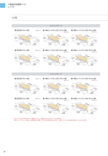 介護施設用電動ベッドレイスト仕様スクエアボード■固定脚(90cm幅)(単位:cm)■4輪ロック[8cm径]90cm幅)■4輪ロック[10cm径](90cm幅)(単位:cm)(単位:cm)100.0(ボード幅)69.0〜107.069.0〜107.0100.0(ボード幅)71.5〜109.5100.0(ボード幅)25.0〜63.0207.0(全長)54.5〜92.5100.0(全幅)25.0〜63.0207.0(全長)54.5〜92.5100.0(全幅)28.0〜66.0207.0(全長)57.0〜95.0100.0(全幅)■固定脚(83cm幅)(単位:cm)■4輪ロック[8cm径]83cm幅)■4輪ロック[10cm径](83cm幅)(単位:cm)(単位:cm)93.0(ボード幅)69.0〜107.069.0〜107.093.0(ボード幅)93.0(ボード幅)71.5〜109.525.0〜63.0207.0(全長)54.5〜92.593.0(全幅)25.0〜63.0207.0(全長)54.5〜92.593.0(全幅)28.0〜66.0207.0(全長)57.0〜95.093.0(全幅)ラウンドボード■固定脚(90cm幅)(単位:cm)■4輪ロック[8cm径]90cm幅)■4輪ロック[10cm径](90cm幅)(単位:cm)(単位:cm)100.0(ボード幅)71.0〜109.071.0〜109.0100.0(ボード幅)73.5〜111.5100.0(ボード幅)25.0〜63.0207.0(全長)56.5〜94.5100.0(全幅)25.0〜63.0207.0(全長)56.5〜94.5100.0(全幅)28.0〜66.0207.0(全長)59.0〜97.0100.0(全幅)■固定脚(83cm幅)(単位:cm)■4輪ロック[8cm径]83cm幅)■4輪ロック[10cm径](83cm幅)(単位:cm)(単位:cm)93.0(ボード幅)71.0〜109.071.0〜109.093.0(ボード幅)93.0(ボード幅)73.5〜111.525.0〜63.0207.0(全長)56.5〜94.593.0(全幅)25.0〜63.0207.0(全長)56.5〜94.593.0(全幅)28.0〜66.0207.0(全長)59.0〜97.093.0(全幅)※スイングしながら昇降するため、脚側は7cm以上、頭側は6cm以上のスペースが必要です。※床からベースフレームの間は、固定脚仕様・4輪ロック(8cm径)仕様の場合は9.0cm、4輪ロック(10cm径)仕様の場合は12.0cmとなります。