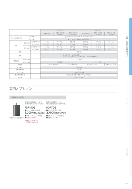 医療・介護施設用電動ベッドマットレス周辺機器マットレス適合寸法90cm幅83cm幅固定脚仕様2モーター4輪ロック仕様(8cm径)4輪ロック仕様(10cm径)固定脚仕様長さ:190.0〜192.0cm、幅:88.0〜91.0cm長さ:190.0〜192.0cm、幅:83.0cm3モーター4輪ロック仕様(8cm径)4輪ロック仕様(10cm径)質量梱包材質90cm幅83cm幅スクエアボードラウンドボードスクエアボードラウンドボード87.0kg89.5kg84.0kg86.5kg87.0kg89.5kg84.0kg86.5kg88.0kg90.5kg85.0kg87.5kg88.5kg91.0kg85.5kg88.0kg88.5kg91.0kg85.5kg88.0kg89.5kg92.0kg86.5kg89.0kg本体部:スチール、ABS樹脂ヘッド・フットボード:プリント紙化粧板、ウレタン樹脂塗装5梱包電動機能背上げ角度膝上げ角度0〜22度0〜17度0〜70度25.0〜63.0cm28.0〜66.0cm25.0〜63.0cm28.0〜66.0cmAC100V100WTiMOTION社製138kg/安全動作荷重:174kg(1700N)ベトナム、中国床面高定格電圧定格消費電力モーター部最大利用者体重原産国専用オプション延長脚(4個組)装着時の床面高は+14cm装着時の床面高は+7cm(最低床面高39cm)になります。(最低床面高32cm)になります。PDP-140GPDP-70G■メーカー希望小売価格■メーカー希望小売価格3,700円(税込4,070円)3,700円(税込4,070円)■材質/スチール、ABS樹脂■材質/スチール、ABS樹脂写真は7cm延長脚です■原産国/ベトナム■原産国/ベトナム※4輪ロック仕様にはご使用できません。