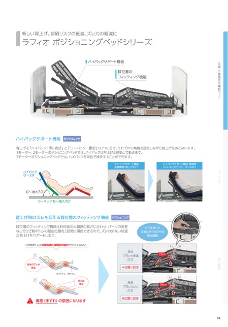 医療・介護施設用電動ベッドマットレス周辺機器新しい背上げ。誤嚥リスクの低減、ズレ力の軽減にラフィオポジショニングベッドシリーズハイバックサポート機能膝位置のフィッティング機能ハイバックサポート機能ポジショニング背上げを「ハイバック:頭-背部」と「ローバック:腰部」の2つに分け、それぞれの角度を調節しながら背上げをおこないます。1モーター、2モーターポジショニングベッドでは、ハイバックは背上げと連動して動きます。3モーターポジショニングベッドでは、ハイバックを単独で操作することができます。ハイバックサポート機能未使用時(背上げ45°)ハイバックサポート機能使用時(ハイバック20°ローバック45°)ハイバック0〜20°0〜最大70°ローバック0〜最大70°背上げ時のズレを抑える膝位置のフィッティング機能ポジショニング膝位置のフィッティング機能は利用者の大腿部の長さに合わせ、パーツの変更なしでひざ脚ボトムの屈曲位置を2段階に調節できるので、ズレの少ない快適な背上げをサポートします。ピンを外して左右にずらすだけの簡単調整!「ひざ脚ボトム」の屈曲位置と膝関節の場所が合っていないと…1身体のズレが発生2ひざボトム脚ボトム圧力が増加褥瘡(床ずれ)の原因になりますAB23cmAB28cm身長175cm未満の方A位置に設定身長175cm以上の方B位置に設定