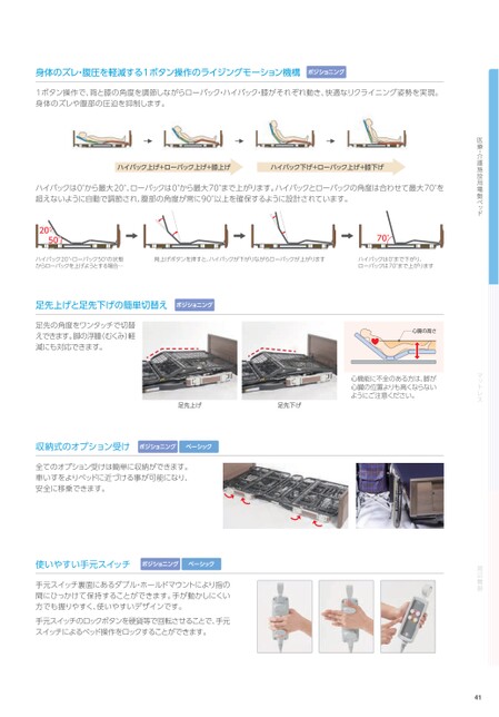 医療・介護施設用電動ベッドマットレス周辺機器身体のズレ・腹圧を軽減する1ボタン操作のライジングモーション機構ポジショニング1ボタン操作で、背と膝の角度を調節しながらローバック・ハイバック・膝がそれぞれ動き、快適なリクライニング姿勢を実現。身体のズレや腹部の圧迫を抑制します。ハイバック上げ+ローバック上げ+膝上げハイバック下げ+ローバック上げ+膝下げハイバックは0°から最大20°、ローバックは0°から最大70°まで上がります。ハイバックとローバックの角度は合わせて最大70°を超えないように自動で調節され、腹部の角度が常に90°以上を確保するように設計されています。20°50°70°ハイバック20°ローバック50°の状態からローバックを上げようとする場合…背上げボタンを押すと、ハイバックが下がりながらローバックが上がりますハイバックは0°まで下がり、ローバックは70°まで上がります足先上げと足先下げの簡単切替えポジショニング足先の角度をワンタッチで切替えできます。脚の浮腫(むくみ)軽減にも対応できます。足先上げ足先下げ心臓の高さ心機能に不全のある方は、脚が心臓の位置よりも高くならないようにご注意ください。収納式のオプション受けポジショニングベーシック全てのオプション受けは簡単に収納ができます。車いすをよりベッドに近づける事が可能になり、安全に移乗できます。使いやすい手元スイッチポジショニングベーシック手元スイッチ裏面にあるダブル・ホールドマウントにより指の間にひっかけて保持することができます。手が動かしにくい方でも握りやすく、使いやすいデザインです。手元スイッチのロックボタンを硬貨等で回転させることで、手元スイッチによるベッド操作をロックすることができます。