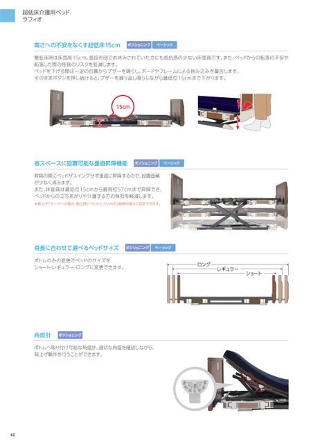 超低床介護用ベッドラフィオ高さへの不安をなくす超低床15cmポジショニングベーシック最低床時は床面高15cm。普段布団でお休みされていた方にも抵抗感の少ない床面高です。また、ベッドからの転落の不安や転落した際の怪我のリスクを低減します。ベッドを下げる際は一定の位置からブザーを鳴らし、ボードやフレームによる挟み込みを警告します。そのままボタンを押し続けると、ブザーを繰り返し鳴らしながら最低位15cmまで下がります。15cm省スペースに設置可能な垂直昇降機能ポジショニングベーシック昇降の際にベッドがスイングせず垂直に昇降するので、設置面積が少なく済みます。また、床面高は最低位15cmから最高位57cmまで昇降でき、ベッドからの立ちあがりや介護する方の負担を軽減します。※背上げ1モーターの場合、組立時に15cmと31cmの2段階の高さに設定できます。身長に合わせて選べるベッドサイズポジショニングベーシックボトムのみの変更でベッドのサイズをショート・レギュラー・ロングに変更できます。ロングレギュラーショート角度計ポジショニングボトムへ取り付け可能な角度計。適切な角度を確認しながら、背上げ動作を行うことができます。
