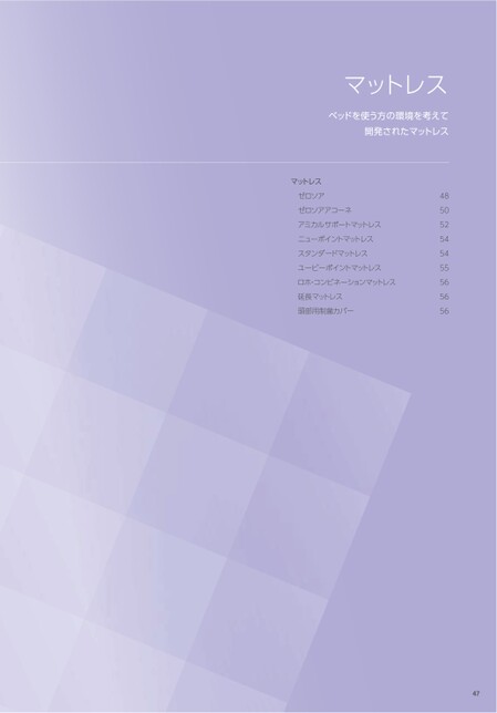 マットレスベッドを使う方の環境を考えて開発されたマットレスマットレスゼロソアゼロソアアコーネアミカルサポートマットレスニューポイントマットレススタンダードマットレスユービーポイントマットレスロホ・コンビネーションマットレス延長マットレス頭部用制菌カバー485052545455565656