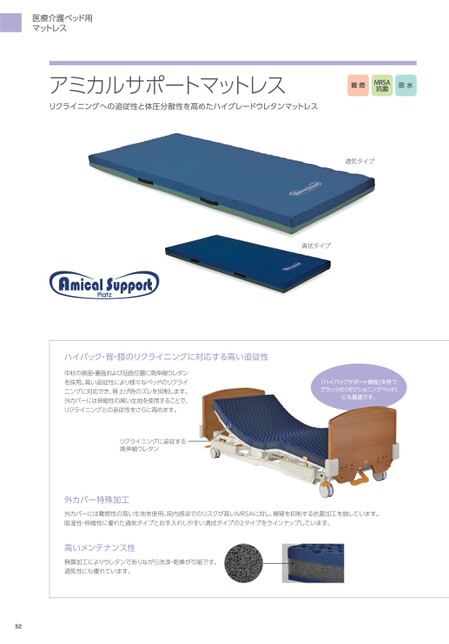 医療介護ベッド用マットレスアミカルサポートマットレスリクライニングへの追従性と体圧分散性を高めたハイグレードウレタンマットレス通気タイプ清拭タイプハイバック・背・膝のリクライニングに対応する高い追従性中材の表面・裏面および屈曲位置に高伸縮ウレタンを採用。高い追従性により様々なベッドのリクライニングに対応でき、背上げ時のズレを抑制します。外カバーには伸縮性の高い生地を使用することで、リクライニングとの追従性をさらに高めます。リクライニングに追従する高伸縮ウレタン「ハイバックサポート機能」を持つプラッツの「ポジショニングベッド」にも最適です。外カバー特殊加工外カバーには難燃性の高い生地を使用。院内感染でのリスクが高いMRSAに対し、増殖を抑制する抗菌加工を施しています。吸湿性・伸縮性に優れた通気タイプとお手入れしやすい清拭タイプの2タイプをラインナップしています。高いメンテナンス性無膜加工によりウレタンでありながら洗浄・乾燥が可能です。通気性にも優れています。
