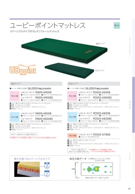 医療・介護施設用電動ベッドマットレス周辺機器ユービーポイントマットレスリバーシブルタイプのウレタンフォームマットレス通気タイプ防水タイプ通気タイプ防水タイプ■メーカー希望小売価格36,000円(税込39,600円)■メーカー希望小売価格36,000円(税込39,600円)90cm幅レギュラータイプPM09-A9008■TAISコード/00631-000464■JANコード/4539940061056ショートタイプPM09-A9008S90cm幅レギュラータイプPD503-A9008■TAISコード/00631-000247■JANコード/4539940060851ショートタイプPD503-A9008S■TAISコード/00631-000467■JANコード/4539940061063■TAISコード/00631-000253■JANコード/4539940060868■寸法/幅90.0×厚さ8.0×長さ191.0cm(ショート182.0cm)■質量/6.1kg(ショート5.9kg)■材質/外カバー:ポリエステル中材:ウレタンフォーム■原産国/ベトナム■寸法/幅90.0×厚さ8.0×長さ191.0cm(ショート182.0cm)■質量/6.1kg(ショート5.9kg)■材質/外カバー:ポリウレタンラミネート、ポリエステル中材:ウレタンフォーム■原産国/ベトナム83cm幅レギュラータイプPM09-A8308■TAISコード/00631-000468■JANコード/4539940061070ショートタイプPM09-A8308S■TAISコード/00631-000469■JANコード/453994006108783cm幅レギュラータイプPD503-A8308■TAISコード/00631-000254■JANコード/4539940060875ショートタイプPD503-A8308S■TAISコード/00631-000255■JANコード/4539940060882■寸法/幅83.0×厚さ8.0×長さ191.0cm(ショート182.0cm)■質量/5.7kg(ショート5.4kg)■材質/外カバー:ポリエステル中材:ウレタンフォーム■原産国/ベトナム■寸法/幅83.0×厚さ8.0×長さ191.0cm(ショート182.0cm)■質量/5.7kg(ショート5.4kg)■材質/外カバー:ポリウレタンラミネート、ポリエステル中材:ウレタンフォーム■原産国/ベトナム外カバーは取り外して洗濯が可能です。※非課税のベッドと同時購入の場合、マットレスは1枚まで非課税となります。78cm幅レギュラータイプPD503-A7808■JANコード/4539940061605■寸法/幅78.0×厚さ8.0×長さ191.0cm■質量/5.4kg■材質/外カバー:ポリウレタンラミネート、ポリエステル中材:ウレタンフォーム■原産国/ベトナム外カバーは取り外して手洗いによる洗濯が可能です。※非課税のベッドと同時購入の場合、マットレスは1枚まで非課税となります。硬さが選べるリバーシブルタイプ体圧分散データ計測機器:SRソフトビジョン全身版(住友理工社製)標準31107段階0(mmHg)被験者:身長164cm体重57kg男性