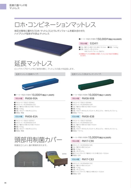 医療介護ベッド用マットレスロホ・コンビネーションマットレス体圧分散性に優れた「ロホ・マットレス」とウレタンフォームを組み合わせたハイブリッド型床ずれ防止マットレス■メーカー希望小売価格150,000円(税込165,000円)90cm幅532411■寸法/幅91.0×厚さ10.0×長さ191.0cm■質量/14.0kg■材質/外カバー:ポリエステル中材:ウレタンフォーム、合成ゴム※非課税のベッドと同時購入の場合、マットレスは1枚まで非課税となります。延長マットレスロングタイプのベッドをご使用の際に、マットレスの長さを延長します。延長マットレス(固綿タイプ)延長マットレス(防水ウレタンタイプ)■メーカー希望小売価格10,000円(税込11,000円)■メーカー希望小売価格10,000円(税込11,000円)90cm幅PM08-90A■TAISコード/00631-000465■JANコード/4539940061032■寸法/幅90.0×厚さ8.0×長さ14.0cm■質量/0.6kg■材質/外カバー・中材:ポリエステル■原産国/韓国83cm幅PM08-83A■TAISコード/00631-000567■JANコード/4539940061018■寸法/幅83.0×厚さ8.0×長さ14.0cm■質量/0.5kg■材質/外カバー・中材:ポリエステル■原産国/韓国頭部用制菌カバー制菌加工により、菌の繁殖を抑えます。90cm幅PM08-90B■TAISコード/00631-000466■JANコード/4539940061049■寸法/幅90.0×厚さ8.0×長さ14.0cm■質量/0.5kg■材質/外カバー:ポリウレタンラミネート、ポリエステル中材:ウレタンフォーム■原産国/ベトナム83cm幅PM08-83B■TAISコード/00631-000568■JANコード/4539940061025■寸法/幅83.0×厚さ8.0×長さ14.0cm■質量/0.4kg■材質/外カバー:ポリウレタンラミネート、ポリエステル中材:ウレタンフォーム■原産国/ベトナム■メーカー希望小売価格15,000円(税込16,500円)90cm幅PM17-C90■JANコード/4539940061285■寸法/幅99.0×長さ54.5cm■質量/0.3kg■材質/ポリエステル使用例■適合マットレスサイズ/幅88.0〜91.0×厚さ8.0〜10.0cm■原産国/日本83cm幅PM17-C83■JANコード/4539940061292■寸法/幅92.0×長さ54.5cm■質量/0.3kg■材質/ポリエステル■適合マットレスサイズ/幅83.0×厚さ8.0〜10.0cm■原産国/日本