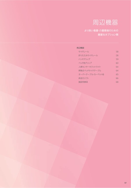 周辺機器より良い看護・介護環境のための豊富なオプション類周辺機器サイドレール折りたたみサイドレールハンドグリップベッド用グリップ人感センサー付フットライト昇降式ベッドサイドテーブルオーバーテーブル・カーペット他床走行リフト施設用家具585859606464656668