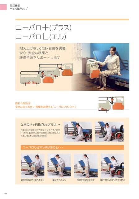 周辺機器ベッド用グリップニーパロ+(プラス)ニーパロ(エル)抱え上げない介護・看護を実現安心・安全な移乗と腰痛予防をサポートします膝折れを防ぎ、安全な立ちあがり・移乗を実現する「ニーパロひざパッド」従来のベッド用グリップでは・・・写真のように膝が前方向にズレ落ちると首を打ったり、転倒するなど危険な状態になることもありました。(ひざ折れ状態)ニーパロひざパッドがあると・・・端座位時のずり落ちを防止楽な立ちあがり立位を安定させます車いすからのずり落ちを防止