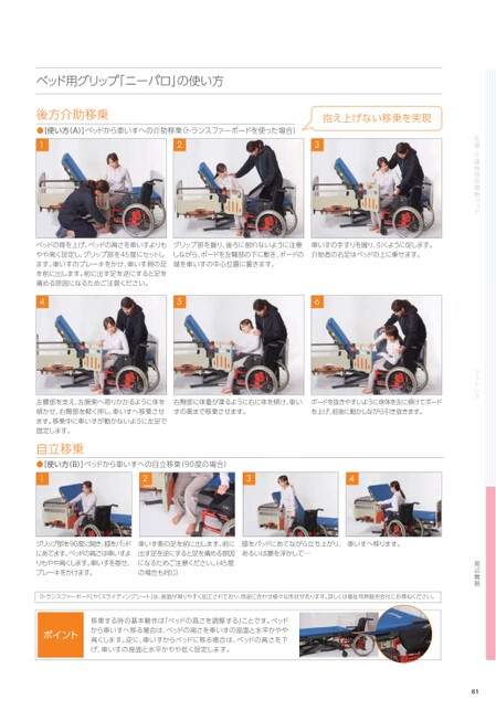医療・介護施設用電動ベッドマットレス周辺機器ベッド用グリップ「ニーパロ」の使い方後方介助移乗抱え上げない移乗を実現●[使い方(A)]ベッドから車いすへの介助移乗(トランスファーボードを使った場合)123ベッドの背を上げ、ベッドの高さを車いすよりもグリップ部を握り、後ろに倒れないように注意車いすの手すりを握り、引くように促します。やや高く設定し、グリップ部を45度にセットししながら、ボードを左臀部の下に敷き、ボードの介助者の右足はベッドの上に乗せます。ます。車いすのブレーキをかけ、車いす側の足端を車いすの中心位置に置きます。を前に出します。前に出す足を逆にすると足を痛める原因になるためご注意ください。456左腰部を支え、左腕側へ寄りかかるように体を右臀部に体重が乗るように右に体を傾け、車いボードを抜きやすいように身体を左に傾けてボード傾かせ、右臀部を軽く押し、車いすへ移乗させすの奥まで移乗させます。を上げ、前後に動かしながら引き抜きます。ます。移乗中に車いすが動かないように左足で固定します。自立移乗●[使い方(B)]ベッドから車いすへの自立移乗(90度の場合)1234グリップ部を90度に開き、膝をパッド車いす側の足を前に出します。前に膝をパッドにあてながら立ち上がり、車いすへ移ります。にあてます。ベッドの高さは車いすよ出す足を逆にすると足を痛める原因あるいは腰を浮かして…りもやや高くします。車いすを寄せ、になるためご注意ください。45度ブレーキをかけます。の場合も同じ)「トランスファーボード」や「スライディングシート」は、表面が滑りやすく加工されており、用途に合わせ様々な形状があります。詳しくは福祉用具販売会社にお尋ねください。移乗する時の基本動作は「ベッドの高さを調整する」ことです。ベッドポイントから車いすへ移る場合は、ベッドの高さを車いすの座面と水平かやや高くします。逆に、車いすからベッドに移る場合は、ベッドの高さを下げ、車いすの座面と水平かやや低く設定します。