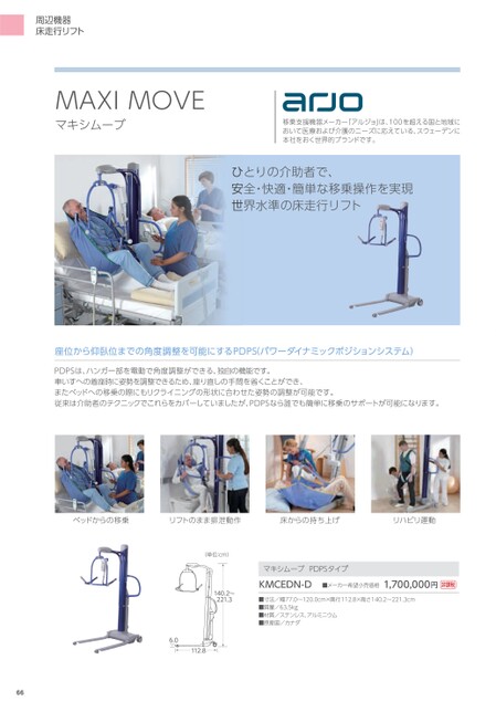 周辺機器床走行リフトMAXIMOVEマキシムーブ移乗支援機器メーカー「アルジョ」は、100を超える国と地域において医療および介護のニーズに応えている、スウェーデンに本社をおく世界的ブランドです。ひとりの介助者で、安全・快適・簡単な移乗操作を実現世界水準の床走行リフト座位から仰臥位までの角度調整を可能にするPDPS(パワーダイナミックポジションシステム)PDPSは、ハンガー部を電動で角度調整ができる、独自の機能です。車いすへの着座時に姿勢を調整できるため、座り直しの手間を省くことができ、またベッドへの移乗の際にもリクライニングの形状に合わせた姿勢の調整が可能です。従来は介助者のテクニックでこれらをカバーしていましたが、PDPSなら誰でも簡単に移乗のサポートが可能になります。ベッドからの移乗リフトのまま排泄動作床からの持ち上げリハビリ運動(単位:cm)140.2〜221.36.0112.8マキシムーブPDPSタイプKMCEDN-D■メーカー希望小売価格1,700,000円非課税■寸法/幅77.0〜120.0cm×奥行112.8×高さ140.2〜221.3cm■質量/63.5kg■材質/ステンレス、アルミニウム■原産国/カナダ