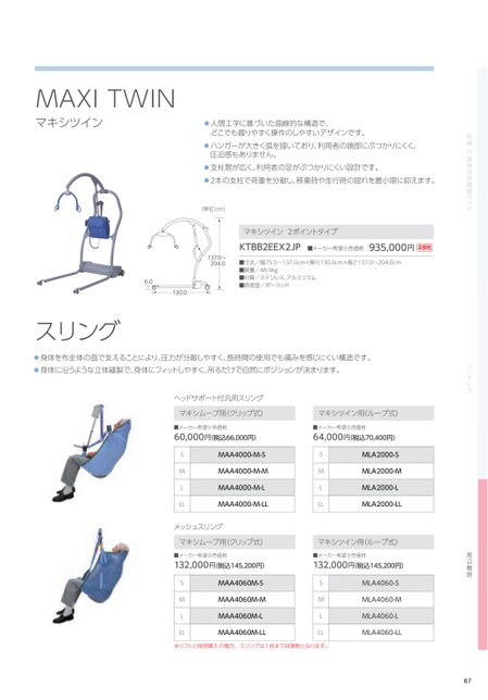 医療・介護施設用電動ベッドマットレス周辺機器MAXITWINマキシツイン●人間工学に基づいた曲線的な構造で、どこでも握りやすく操作のしやすいデザインです。●ハンガーが大きく弧を描いており、利用者の頭部にぶつかりにくく、圧迫感もありません。●支柱間が広く、利用者の足がぶつかりにくい設計です。●2本の支柱で荷重を分散し、移乗時や走行時の揺れを最小限に抑えます。(単位:cm)マキシツイン2ポイントタイプKTBB2EEX2JP■メーカー希望小売価格935,000円非課税137.0〜204.0■寸法/幅75.5〜137.0cm×奥行130.0cm×高さ137.0〜204.0cm6.0130.0■質量/48.9kg■材質/ステンレス、アルミニウム■原産国/ポーランドスリング●身体を布全体の面で支えることにより、圧力が分散しやすく、長時間の使用でも痛みを感じにくい構造です。●身体に沿うような立体縫製で、身体にフィットしやすく、吊るだけで自然にポジションが決まります。ヘッドサポート付汎用スリングマキシムーブ用(クリップ式)マキシツイン用(ループ式)■メーカー希望小売価格■メーカー希望小売価格60,000円(税込66,000円)64,000円(税込70,400円)SMLLLMAA4000-M-SMAA4000-M-MMAA4000-M-LMAA4000-M-LLメッシュスリングSMLLLMLA2000-SMLA2000-MMLA2000-LMLA2000-LLマキシムーブ用(クリップ式)マキシツイン用(ループ式)■メーカー希望小売価格■メーカー希望小売価格132,000円(税込145,200円)132,000円(税込145,200円)SMLLLMAA4060M-SMAA4060M-MMAA4060M-LMAA4060M-LLSMLLLMLA4060-SMLA4060-MMLA4060-LMLA4060-LL※リフトと同時購入の場合、スリングは1枚まで非課税となります。