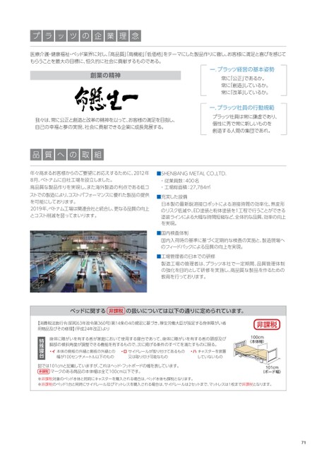プラッツの企業理念医療介護・健康福祉・ベッド業界に対し、高品質」「高機能」「低価格」をテーマにした製品作りに徹し、お客様に満足と喜びを感じてもらうことを最大の目標に、恒久的に社会に貢献するものである。創業の精神我々は、常に公正と創造と改革の精神を以って、お客様の満足を目指し、自己の幸福と夢の実現、社会に貢献できる企業に成長発展する。品質への取組一.プラッツ経営の基本姿勢常に「公正」であるか。常に「創造」しているか。常に「改革」しているか。一.プラッツ社員の行動規範プラッツ社員は常に謙虚であり、個性に秀で常に新しいものを創造する人間の集団であれ。年々高まるお客様からのご要望にお応えするために、2012年■SHENBANGMETALCO.,LTD.8月、ベトナムに自社工場を設立しました。・従業員数:400名高品質な製品作りを実現し、また海外製造の利点である低コ・工場総面積:27,784㎡ストでの製造により、コストパフォーマンスに優れた製品の提供■充実した設備を可能にしております。2019年、ベトナム工場は関連会社と統合し、更なる品質の向上とコスト削減を図ってまいります。日本製の最新鋭溶接ロボットによる溶接時間の効率化、熱変形のリスク低減や、ED塗装と粉体塗装を1工程で行うことができる塗装ラインによる大幅な時間短縮など、全体的な品質、効率の向上を実現。■国内検査体制国内入荷時の基準に基づく定期的な検査の実施と、製造現場へのフィードバックによる品質の向上を実現。■工場管理者の日本での研修製造工場の管理者は、プラッツ本社で一定期間、品質管理体制の強化を目的として研修を実施し、高品質な製品を作るための教育を行っております。ベッドに関するの扱いについては以下の通りに定められています。100cm(本体幅)101cm(ボード幅)【消費税法施行令(昭和63年政令第360号)第14条の4の規定に基づき、厚生労働大臣が指定する身体障がい者用物品及びその修理】平成24年改正)より身体に障がいを有する者が家庭において使用する寝台であって、身体に障がいを有する者の頭部及び脚部の傾斜角度が調整できる機能を有するもので、次に掲げる条件のすべてを満たすものに限る。・イ本体の側板の外縁と側板の外縁との・ロサイドレールが取り付けてあるもの・ハキャスターを装置幅が100センチメートル以下のもの又は取り付け可能なものしていないもの特殊寝台図では101cmと記載していますが、これはヘッド・フットボードの幅を表しています。マークのある商品の本体幅は全て100cm以下です。※非課税対象のベッド本体と同時にキャスターを購入される場合は、ベッド本体も課税となります。※非課税のベッド1台と同時にサイドレール及びマットレスを購入される場合は、サイドレールは2セットまで、マットレスは1枚まで非課税となります。