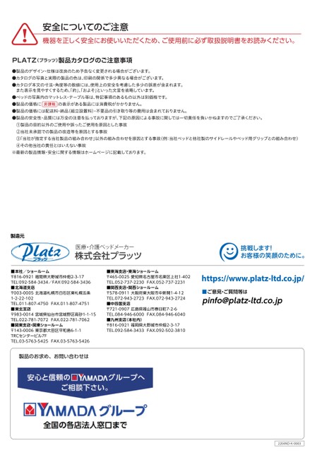 安全についてのご注意機器を正しく安全にお使いいただくため、ご使用前に必ず取扱説明書をお読みください。PLATZ(プラッツ)製品カタログのご注意事項●製品のデザイン・仕様は改良のため予告なく変更される場合がございます。●カタログの写真と実際の製品の色は、印刷の関係で多少異なる場合がございます。●カタログ本文の寸法・角度等の数値には、使用上の安全を考慮した多少の誤差が含まれます。また表示を見やすくするため、約」、およそ」といった文言を省略しています。●ベッドの写真内のマットレス・テーブル等は、特記事項のあるもの以外は別価格です。●製品の価格にの表示がある製品には消費税がかかりません。●製品の価格には配送料・納品(組立設置料)・不要品の引き取り等の費用は含まれておりません。●製品の安全性・品質には万全の注意を払っておりますが、下記の原因による事故に関しては一切責任を負いかねますのでご了承ください。非課税①製品の目的以外のご使用や誤ったご使用を原因とした事故②当社未承認での製品の改造等を原因とする事故③「当社が指定する当社製品の組み合わせ」以外の組み合わせを原因とする事故(例:当社ベッドと他社製のサイドレールやベッド用グリップとの組み合わせ)④その他当社の責任とはいえない事故※最新の製品情報・安全に関する情報はホームページに記載しております。製造元医療・介護ベッドメーカー株式会社プラッツ