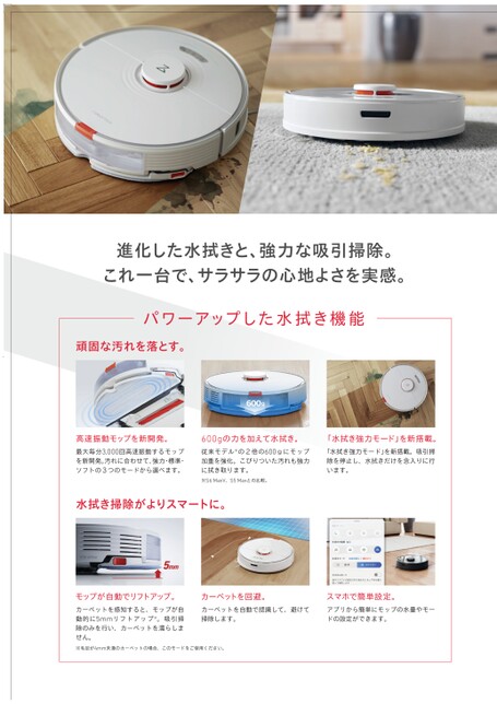 進化した水拭きと、強力な吸引掃除。これ一台で、サラサラの心地よさを実感。パワーアップした水拭き機能頑固な汚れを落とす。高速振動モップを新開発。最大毎分3,000回高速振動するモップを新開発。汚れに合わせて、強力・標準・ソフトの3つのモードから選べます。600gの力を加えて水拭き。従来モデル※の2倍の600gにモップ加重を強化。こびりついた汚れも強力に拭き取ります。※S6MaxV、S5Maxとの比較。「水拭き強力モード」を新搭載。「水拭き強力モード」を新搭載。吸引掃除を停止し、水拭きだけを念入りに行います。水拭き掃除がよりスマートに。モップが自動でリフトアップ。カーペットを感知すると、モップが自動的に5mmリフトアップ※。吸引掃除のみを行い、カーペットを濡らしません。※毛足が4mm未満のカーペットの場合、このモードをご使用ください。カーペットを回避。カーペットを自動で認識して、避けて掃除します。スマホで簡単設定。アプリから簡単にモップの水量やモードの設定ができます。