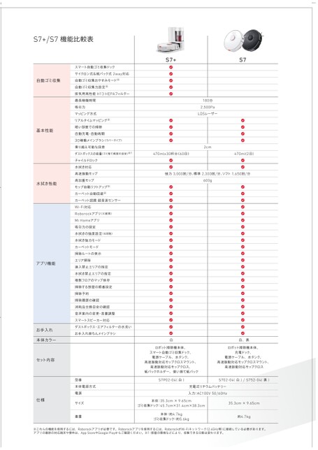 S7+/S7機能比較表自動ゴミ収集基本性能水拭き性能アプリ機能お手入れ本体カラーセット内容仕様スマート自動ゴミ収集ドックサイクロン式&紙パック式2way対応自動ゴミ収集おやすみモード※自動ゴミ収集力設定※排気用高性能H13HEPAフィルター最長稼働時間吸引力マッピング方式リアルタイムマッピング※暗い部屋での掃除自動充電・自動再開3D稼働メインブラシ(ラバータイプ)乗り越え可能な段差ダストボックスの容量(ゴミ捨て頻度の目安)※1チャイルドロック水拭き対応高速振動モップ高加重モップモップ自動リフトアップ※カーペット自動回避※カーペット認識超音波センサーWi-Fi対応Roborockアプリ(※推奨)MiHomeアプリ吸引力の設定水拭きの強度設定(4段階)水拭き強力モードカーペットモード掃除ルートの表示エリア掃除進入禁止エリアの指定水拭き禁止エリアの指定複数フロアのマップ保存掃除する部屋の順番設定掃除予約掃除履歴の確認消耗品交換目安の確認音声案内の変更・音量調整スマートスピーカー対応ダストボックス・エアフィルターの水洗いお手入れ楽ちんメインブラシS7+S7180分2,500PaLDSレーザー470mlx30杯分(60日)470ml(2日)2cm強力3,000回/分、標準2,300回/分、ソフト1,650回/分600g白白、黒ロボット掃除機本体、スマート自動ゴミ収集ドック、電源ケーブル、水タンク、高速振動対応モップクロスマウント、高速振動対応モップクロス、紙パックホルダー、使い捨て紙パックロボット掃除機本体、充電ドック、電源ケーブル、水タンク、高速振動対応モップクロスマウント、高速振動対応モップクロス型番本体電源方式電源サイズ重量S7P02-04(白)S702-04(白)/S752-04(黒)充電式リチウムバッテリー入力:AC100V50/60Hz本体:35.3cm×9.65cmゴミ収集ドック:45.7cm×31.4cm×38.3cm本体:約4.7kgゴミ収集ドック:約5.6kg35.3cm×9.65cm約4.7kg※これらの機能を使用するには、Roborockアプリが必要です。Roborockアプリを使用するには、RoborockがWi-Fiネットワーク(2.4GHz帯)に接続している必要があります。アプリの最新の対応端末や要件は、AppStoreやGooglePlayからご確認ください。※1:部屋の環境などにより、収集できる日数は変わります。